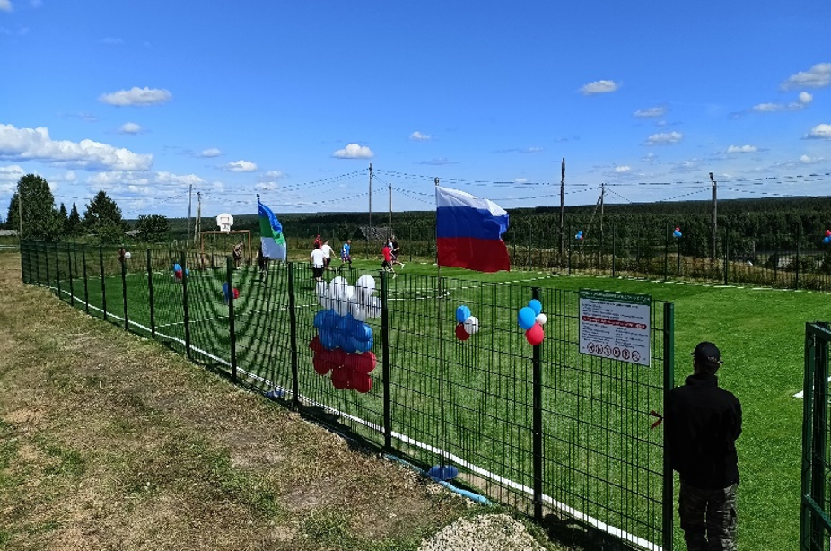 На территории возле дома д. 87 в селе Нившера состоялось торжественное открытие нового футбольного поля с безопасным покрытием.