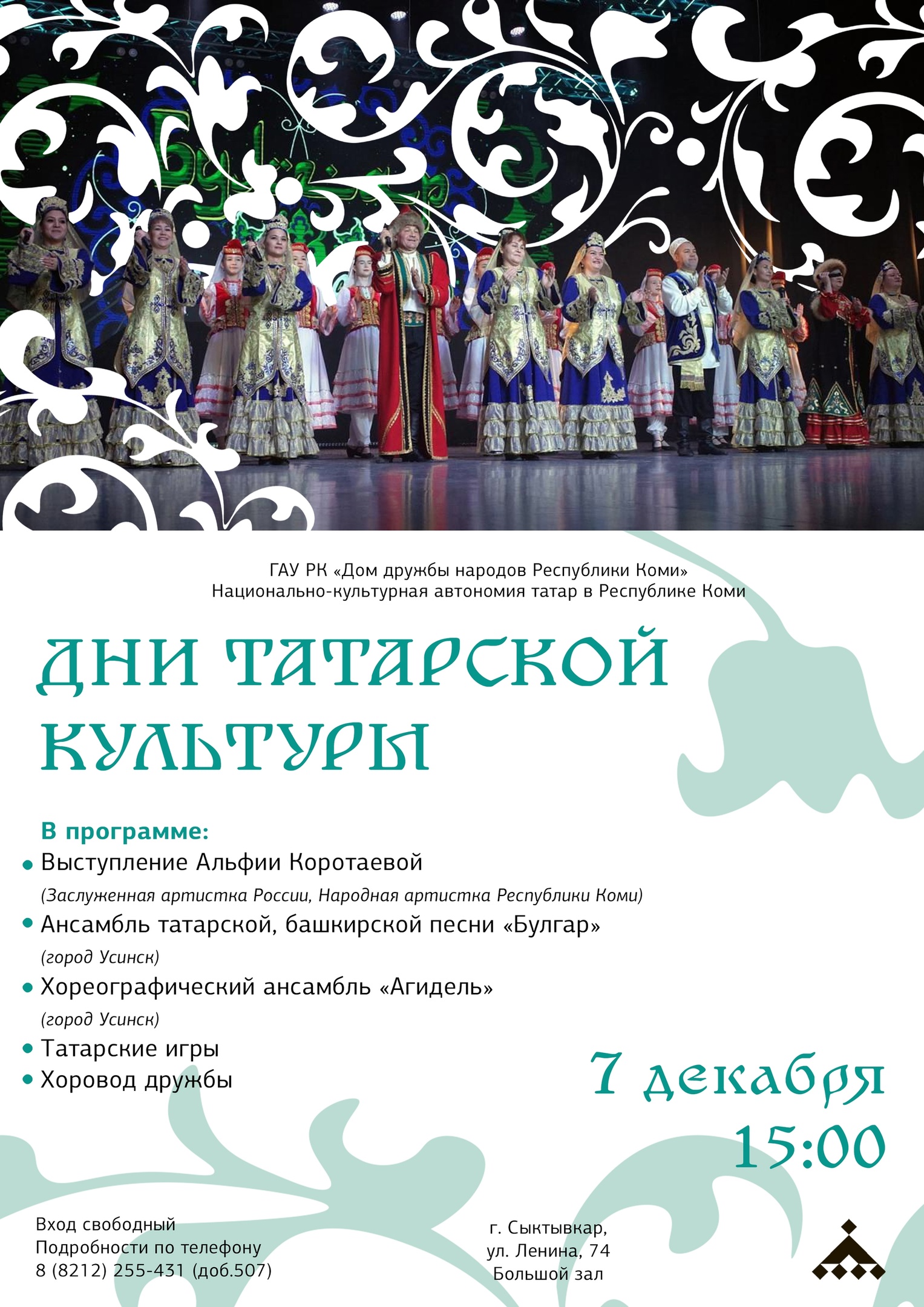 7 декабря в Доме дружбы народов Республики Коми откроются Дни татарской культуры, посвященные сохранению и популяризации традиций и искусства татарского народа. Программа мероприятий обещает быть яркой и разнообразной.
