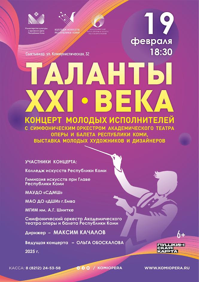 19 февраля в Академическом театре оперы и балета Республики Коми пройдет творческий проект «Таланты XXI века». Мероприятие соберет юных музыкантов, художников, дизайнеров из разных уголков Республики Коми, а также Москвы и подарит им уникальную возможность продемонстрировать свои способности.