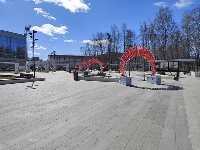 На последней точке идет установка трех кольцевых световых арок, которые будут украшены флагами. Далее здесь установят тематическую фотозону. Помимо этого, в районе площадки «под часами» появятся выставочные стенды.