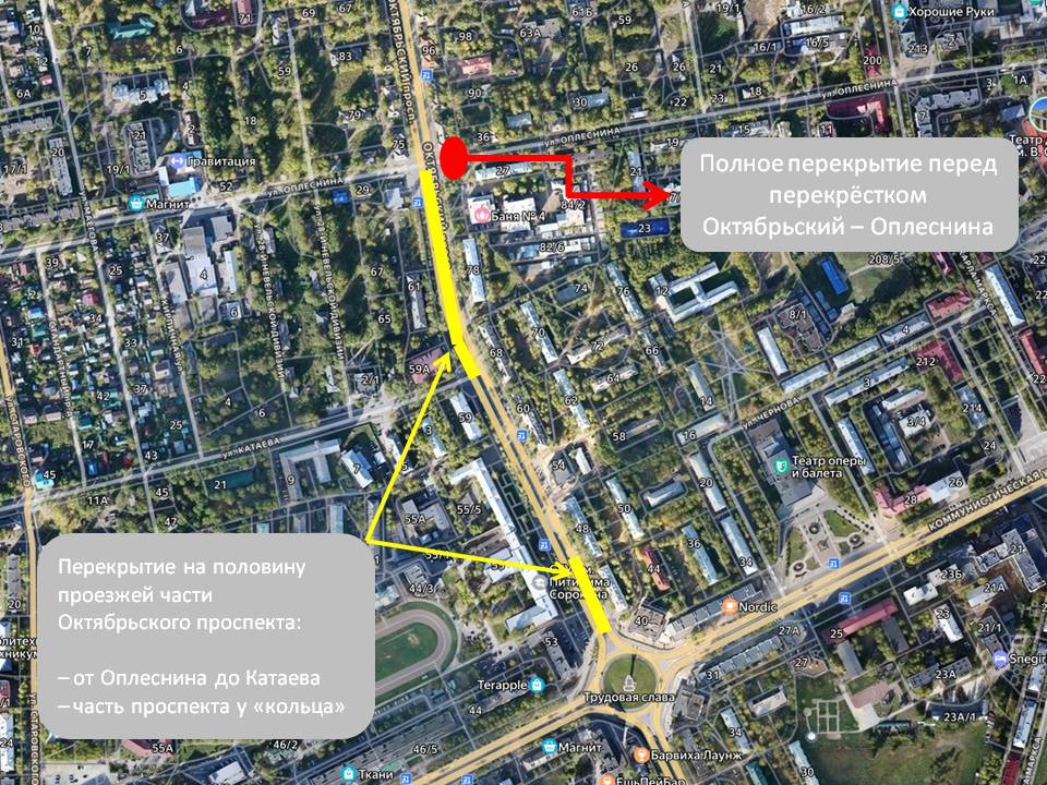 – на 1/2 ширины проезжей части Октябрьского проспекта от улицы Коммунистической до дома № 48 по Октябрьскому проспекту. Объезд возможно будет осуществлять через улицы Маегова, 28-й Невельской дивизии, Катаева, Орджоникидзе, Юхнина, Карла Маркса, а также ограничено движение пешеходов: