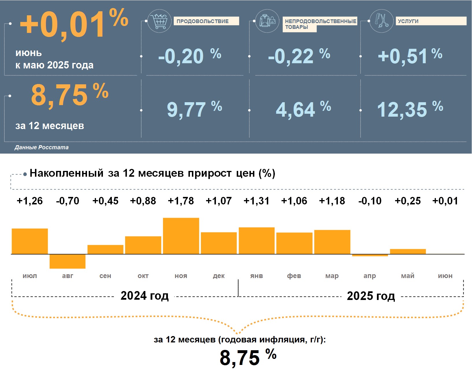 В июне повысились цены только на услуги. За год они подорожали сильнее, чем потребительская корзина в целом. Продовольствие за месяц подешевело, но в целом за 12 месяцев прирост цен был больше, чем на все товары и услуги. Цены на непродовольственные товары в июне также снизились, а в годовом выражении выросли умеренно.