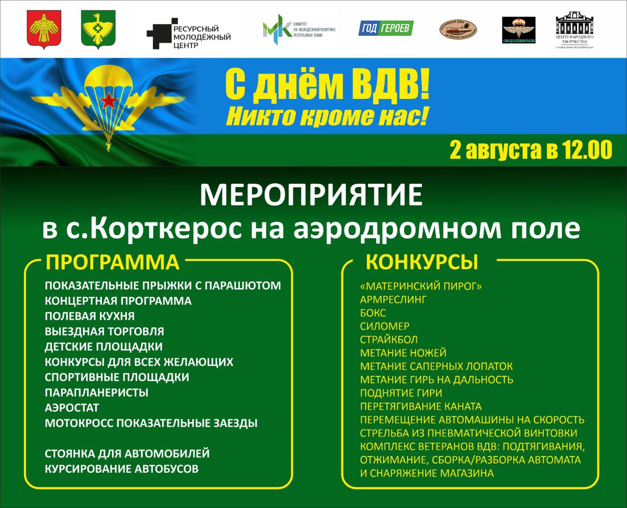 2 августа на аэродроме в Корткеросе состоится праздничная программа, посвящённая 95-й годовщине образования Воздушно-десантных войск России. В мероприятии примут участие более 200 человек. Гостей ждут спортивные состязания, показательные выступления и концертная программа.