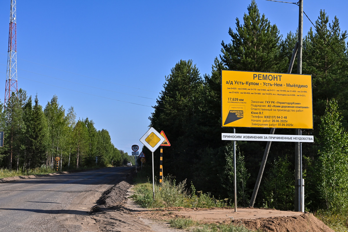 Ведутся ремонтные работы на автомобильной дороге Усть-Кулом – Усть-Нем – Мыёлдино. Подрядчиком на объекте выступает АО «Коми дорожная компания». Общая протяжённость ремонтируемого участка – 17,6 км. На сегодняшний день работы находятся на начальной стадии, готовность составляет 4 %. Завершить строительно-монтажные работы планируется до 1 сентября 2025 года.