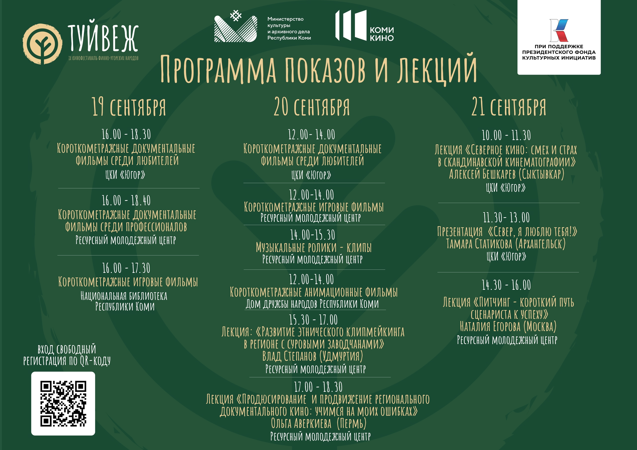 Участников фестиваля ожидает насыщенная культурная программа: экскурсия по Сыктывкару, мастер-классы, познавательные лекции и многое другое.