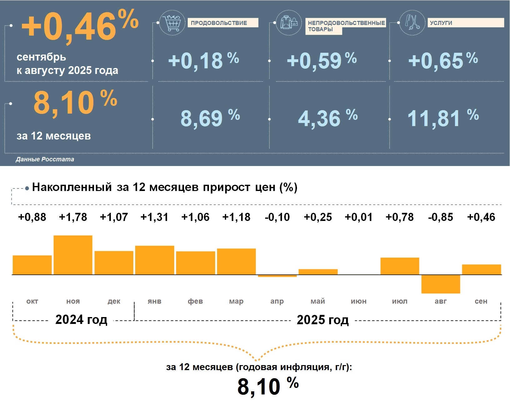 Цены в Республике Коми в сентябре 2025 года, по данным Росстата, выросли по сравнению с августом на 0,46%. Годовая инфляция практически не изменилась и составила 8,10%. Это выше, чем в целом по стране (7,98%).